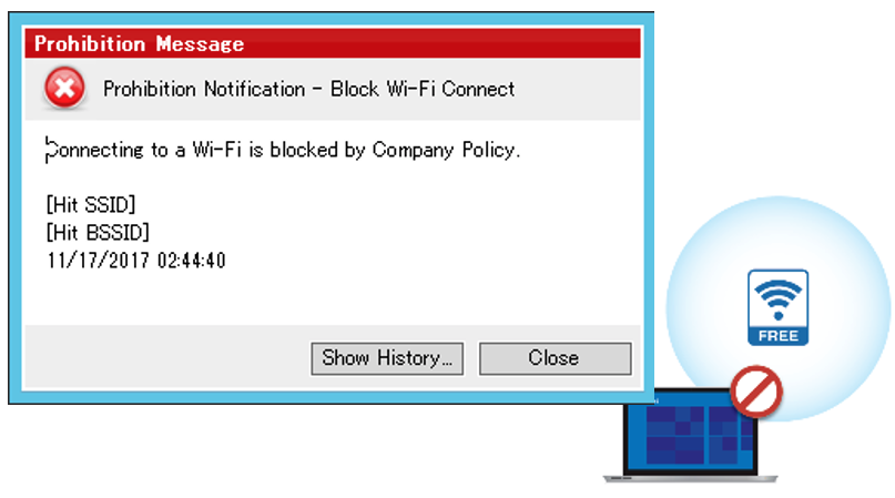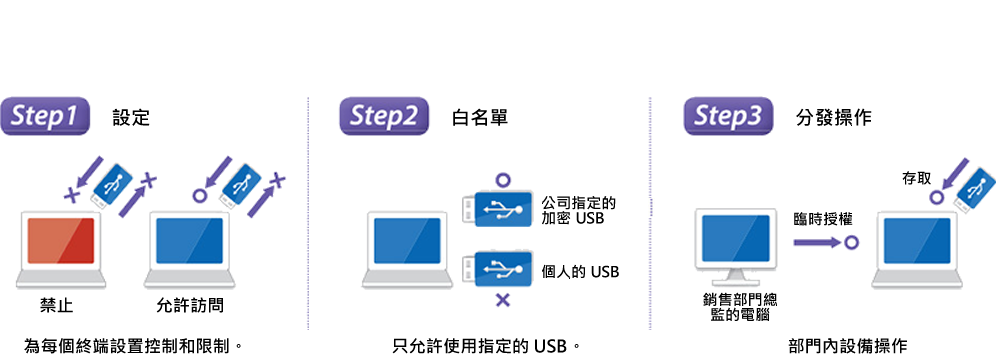 管理所有公司設備並限制其使用。如果連接了被禁止的設備,則通知用戶該設備被禁止並且非法使用受到控制。此外,通過PC和設備設置詳細條件以適應工作場所,允許設備在有限的情況下使用。