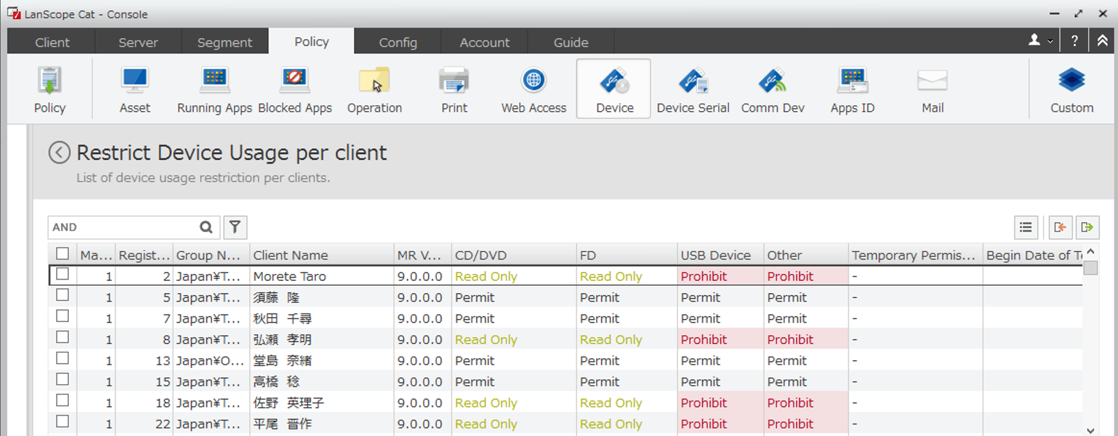 DVD / USB存儲器等各種設備類型的限制/禁止使用靈活設置,例如禁止讀取/寫入,每台PC僅禁止寫入