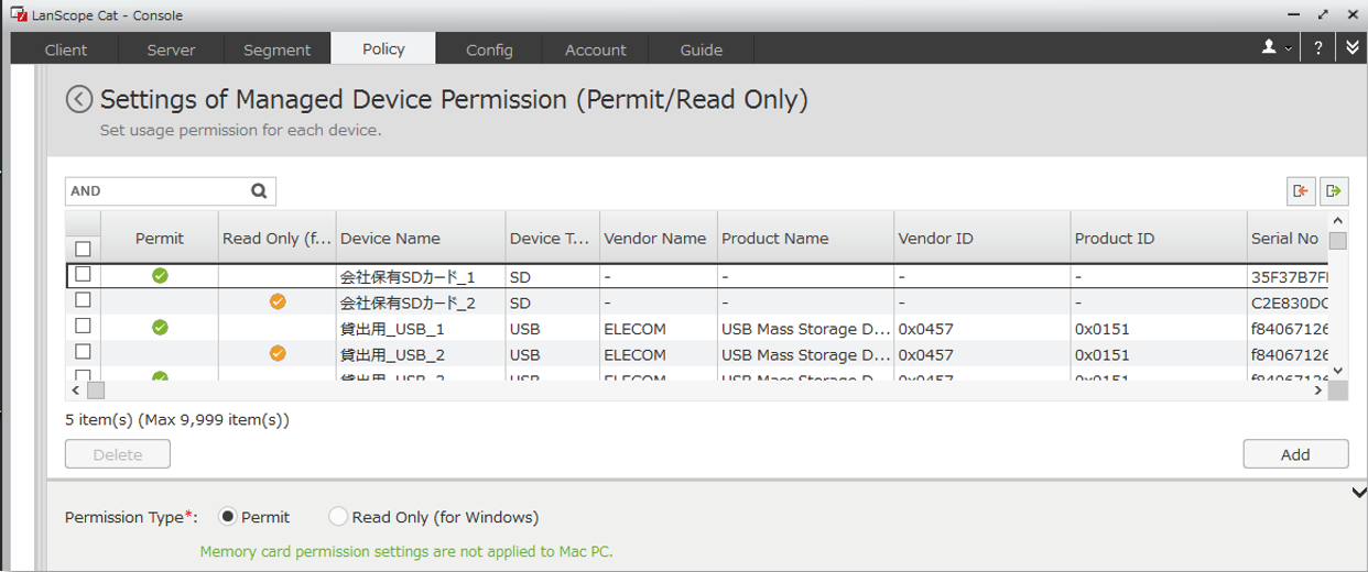 即使SD卡等沒有識別號的設備也可以單獨設置為允許/只讀/臨時許可/臨時只讀。