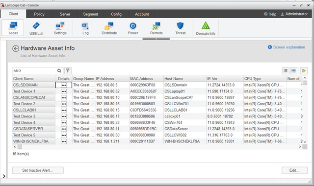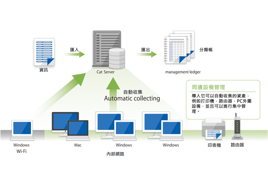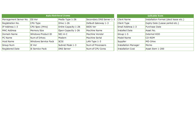 自動收集超過 50 種硬體訊息,如PC名稱和 IP 地址,以及可選設置的註冊表數據。記錄和管理印表機和其他外圍設備。