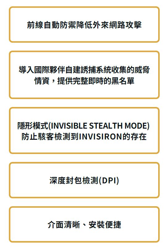 Invisiron的網路防禦解決方案收集全球安全威脅情資主動防禦外來攻擊,透過誘捕系統以取得更多情資訊息。